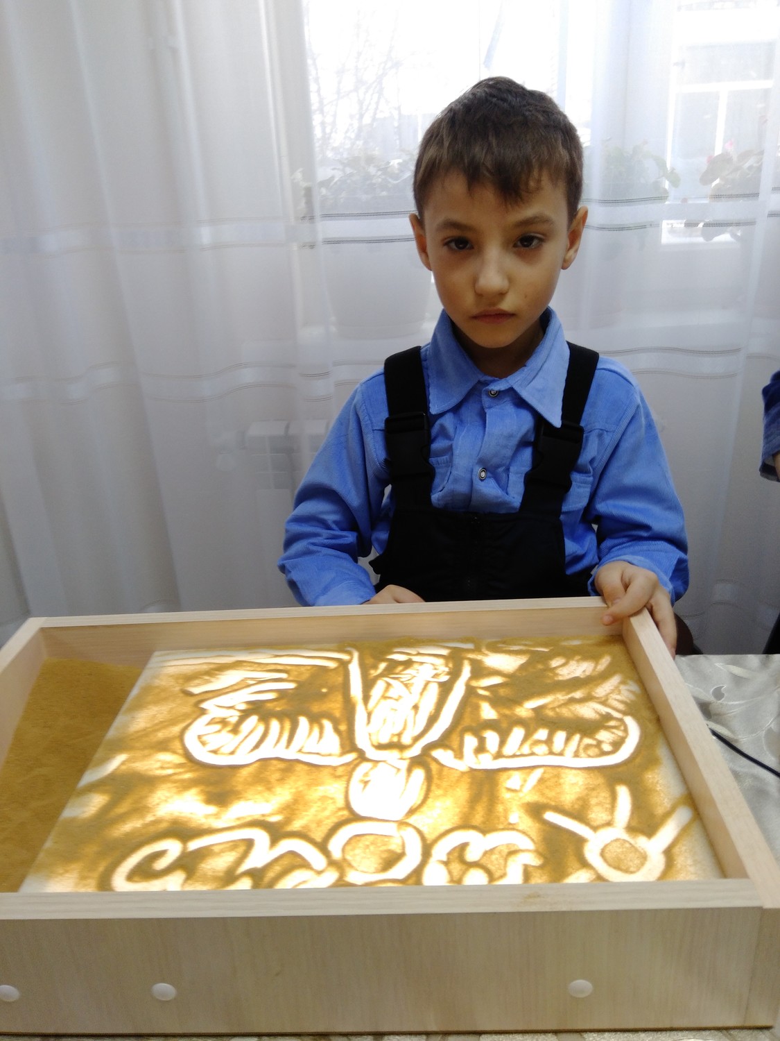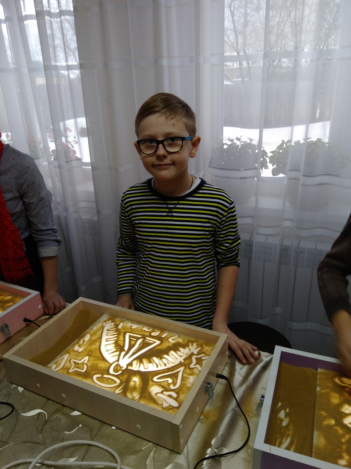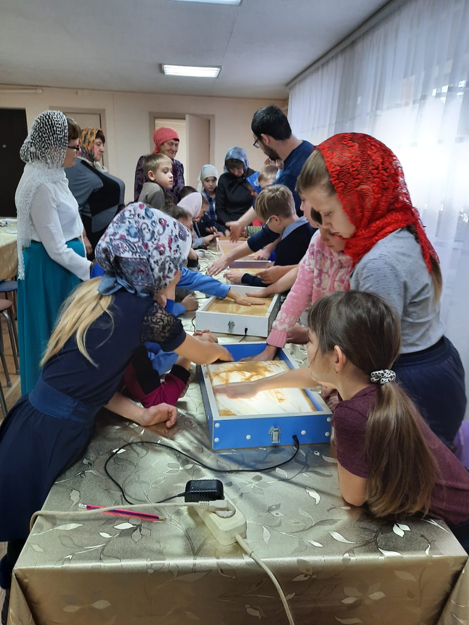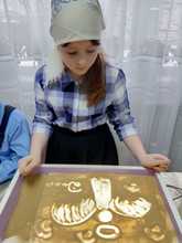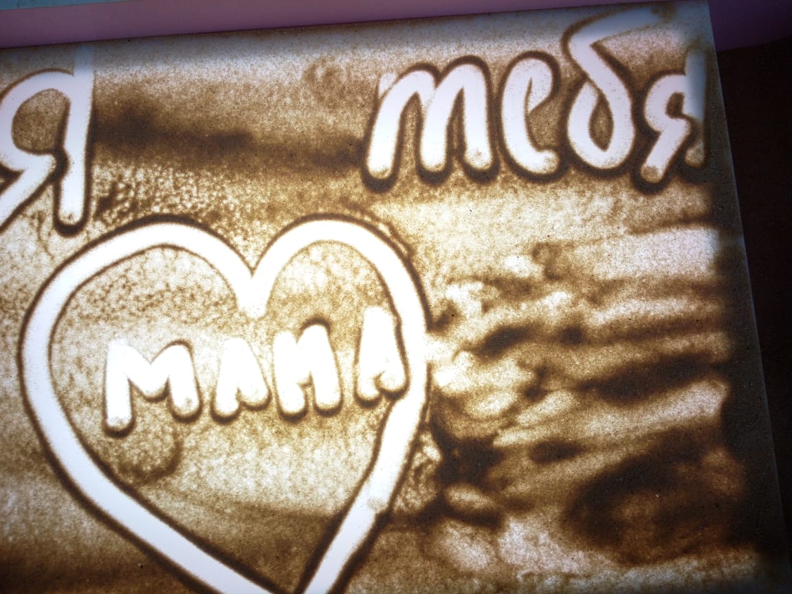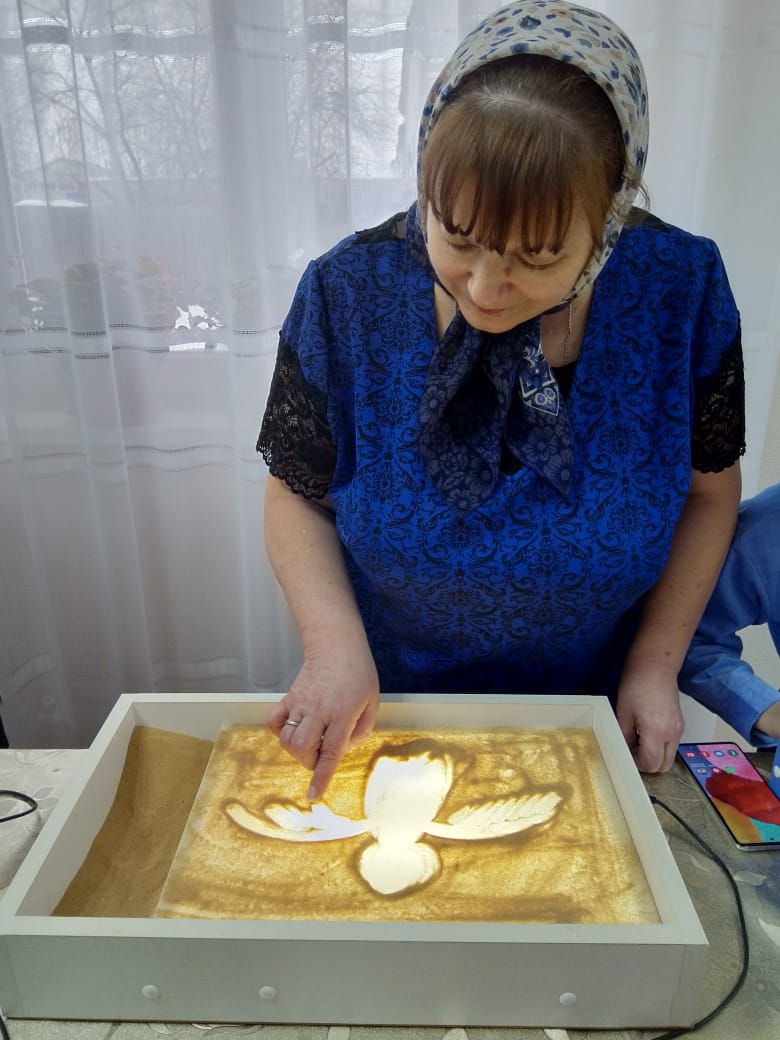 Далее детям представилась возможность самостоятельно изобразить своих «Ангелов Победы». Они рисовали разные образы с помощью пальцев рук и воображения, что благотворно влияет не только на развитие мелкой моторики, но и на общее состояние человека, успокаивает и вызывает приятные эмоции. Всем присутствующим понравилось рисовать и даже Матушка не отказалась попробовать себя в роли художника на песке.