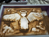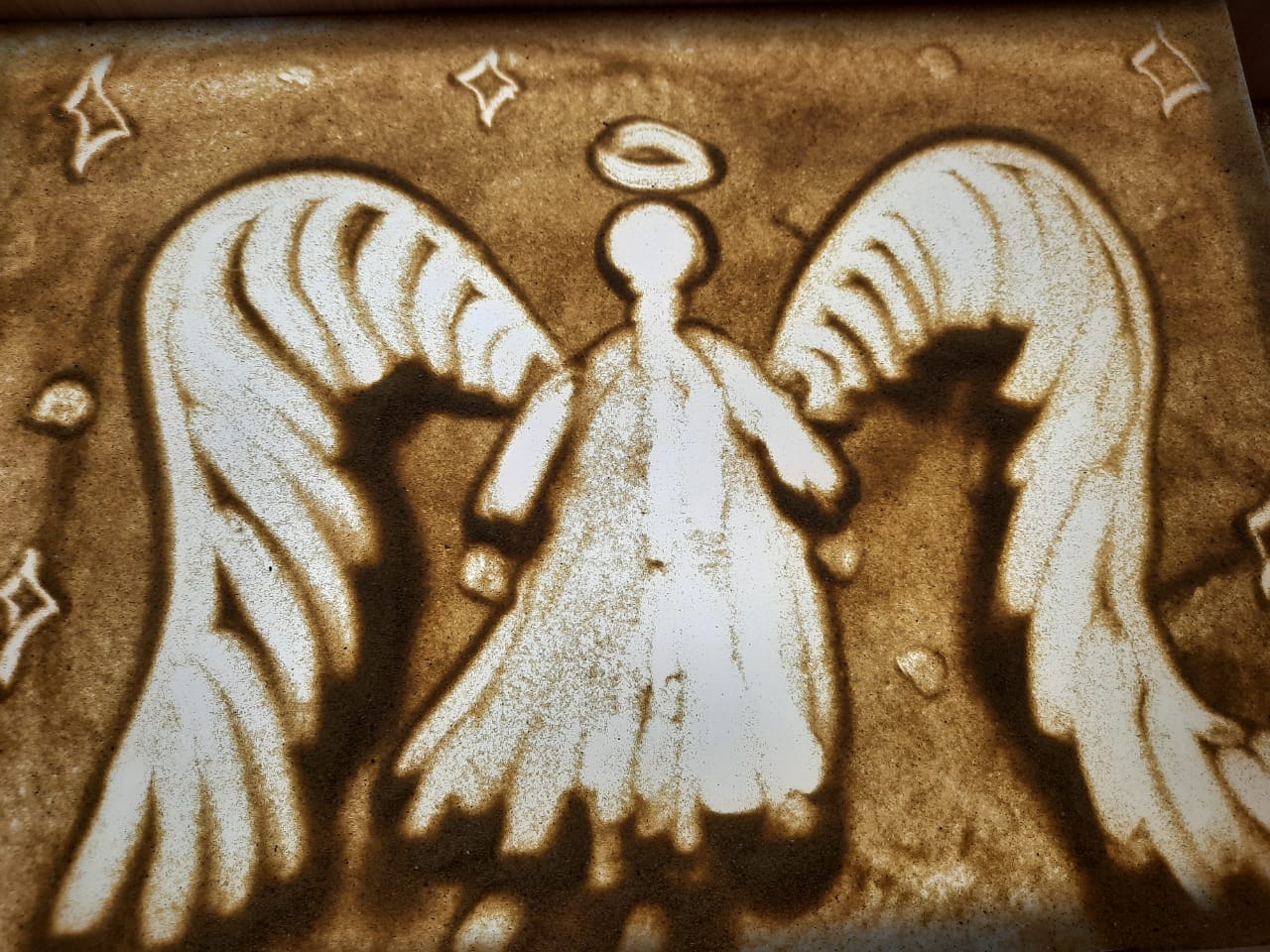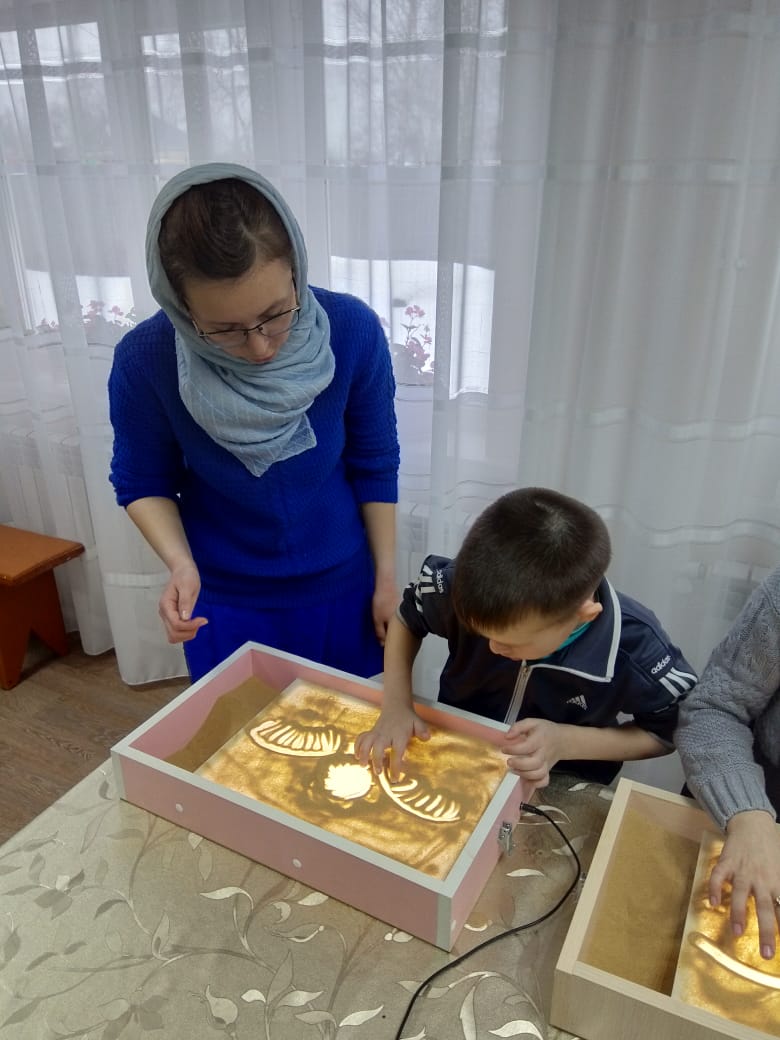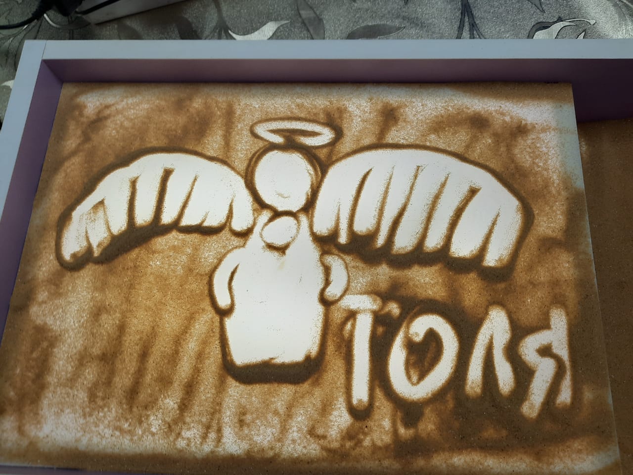 В продолжении темы, педагогом дополнительного образования Больных Г. В., было сказано: «…В этом году Мы отмечаем большой праздник – 75 лет Великой Победы. Те, кто воевал за Нас, за родные места, за будущее Нашей Великой Страны и отдал жизнь, те, по моему мнению, могут и стали ангелами, которые и по сей день оберегают Нас…». Перед началом занятия воспитанникам был показам мастер-класс по рисованию песком «Ангелы Победы», педагогом дополнительного образования МБУ ДО «Дом творчества», Больных Глебом Викторовичем и воспитателем МКДОУ Постниковского детского сада №13, Пушилиной Эллой Александровной.