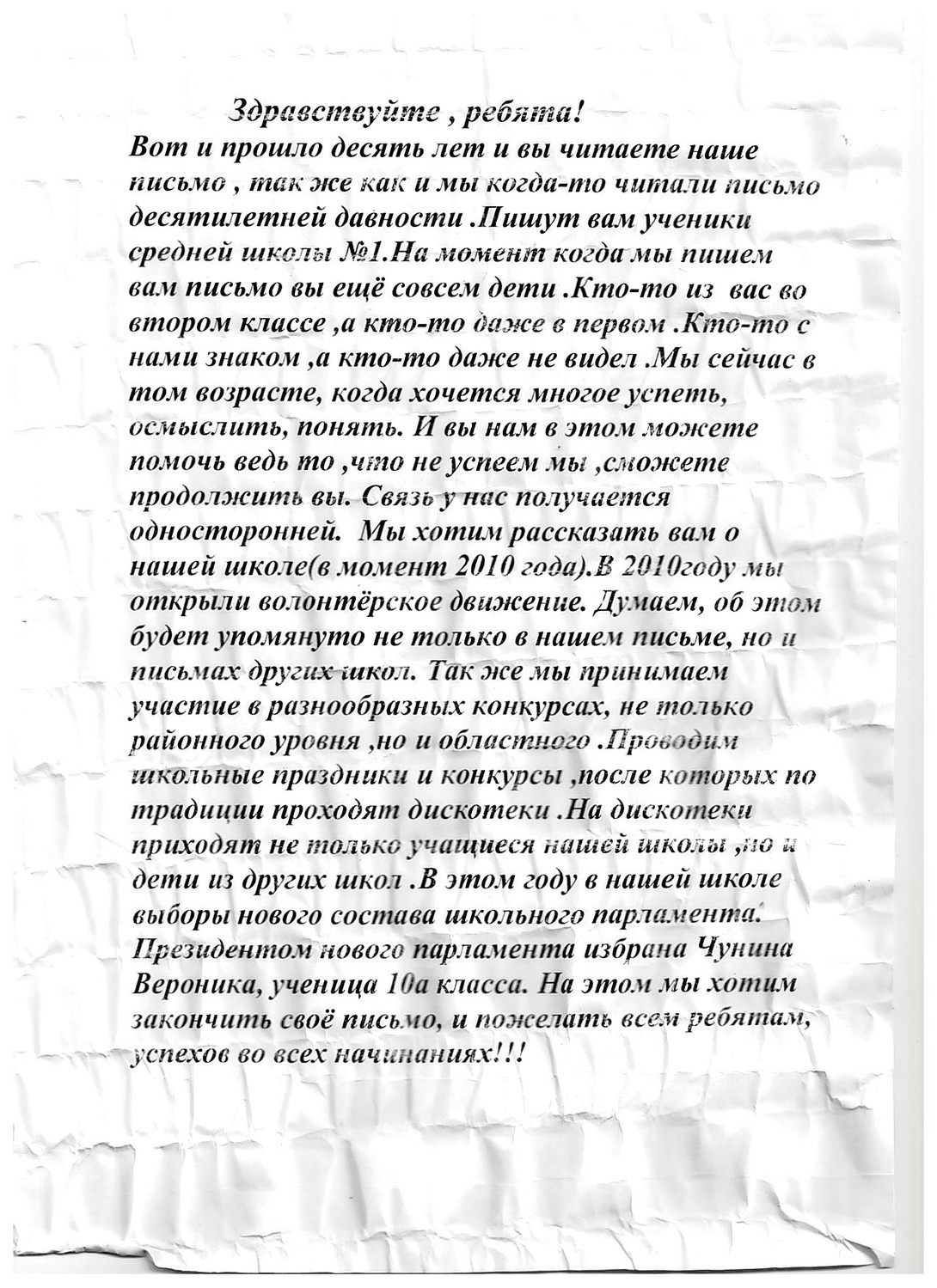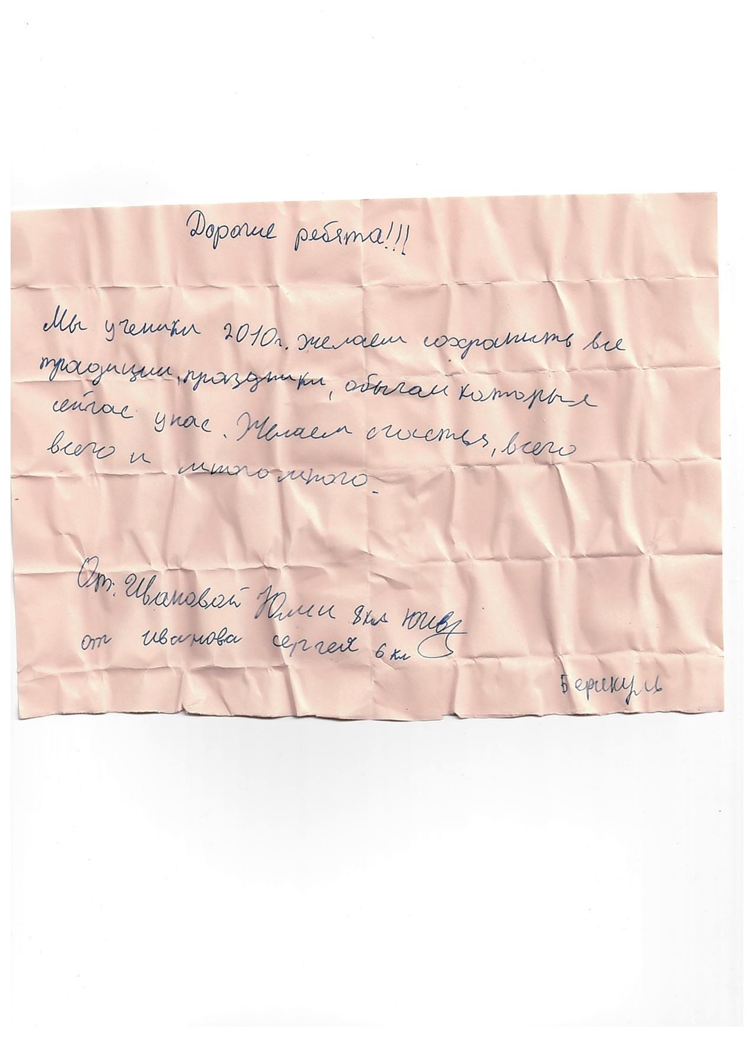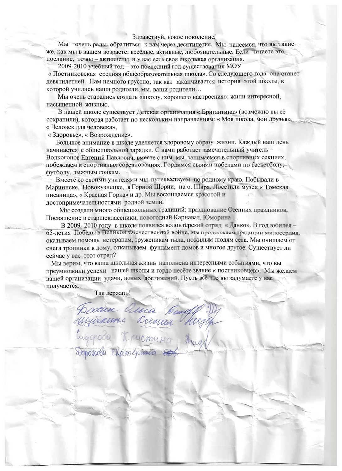 Ключом слёта стало вскрытие «пакета из прошлого», «капсул для потомков». 29 марта 2010 года активисты районного движения написали обращение к потомкам 2020 Среди них Ледовских Ксения, Безволенко Дарья, Чунина Вероника, Ледовских Настя, Тихова Светлана (Ижморская школа №1), Копылова Света, Аксенова Анжелика, Гольцман Алена (Новославянская школа), Лаптева Анна, Толмачева Елена, Селиверстова Екатерина, (Ижморская школа №2), Никольская Настя, Малышко Наталья (Симбирская школа), Иванова Юлия, Иванов Сергей (Берикульская школа), Бохан Ольга, Шубекина Ксения,Сидорова Кристина, Дорохова Екатерина (Постниковская школа), Ваганова Татьяна, Струкова Дарья, Ваганова Мария (Троицкая школа). Все ребята отметили, что в школах созданы волонтерские отряды, пожелали продолжать традиции, слушать клубняки, старались вывести школу на высшее место, ведите здоровый образ жизни как мы, путешествуем по родному краю и др.