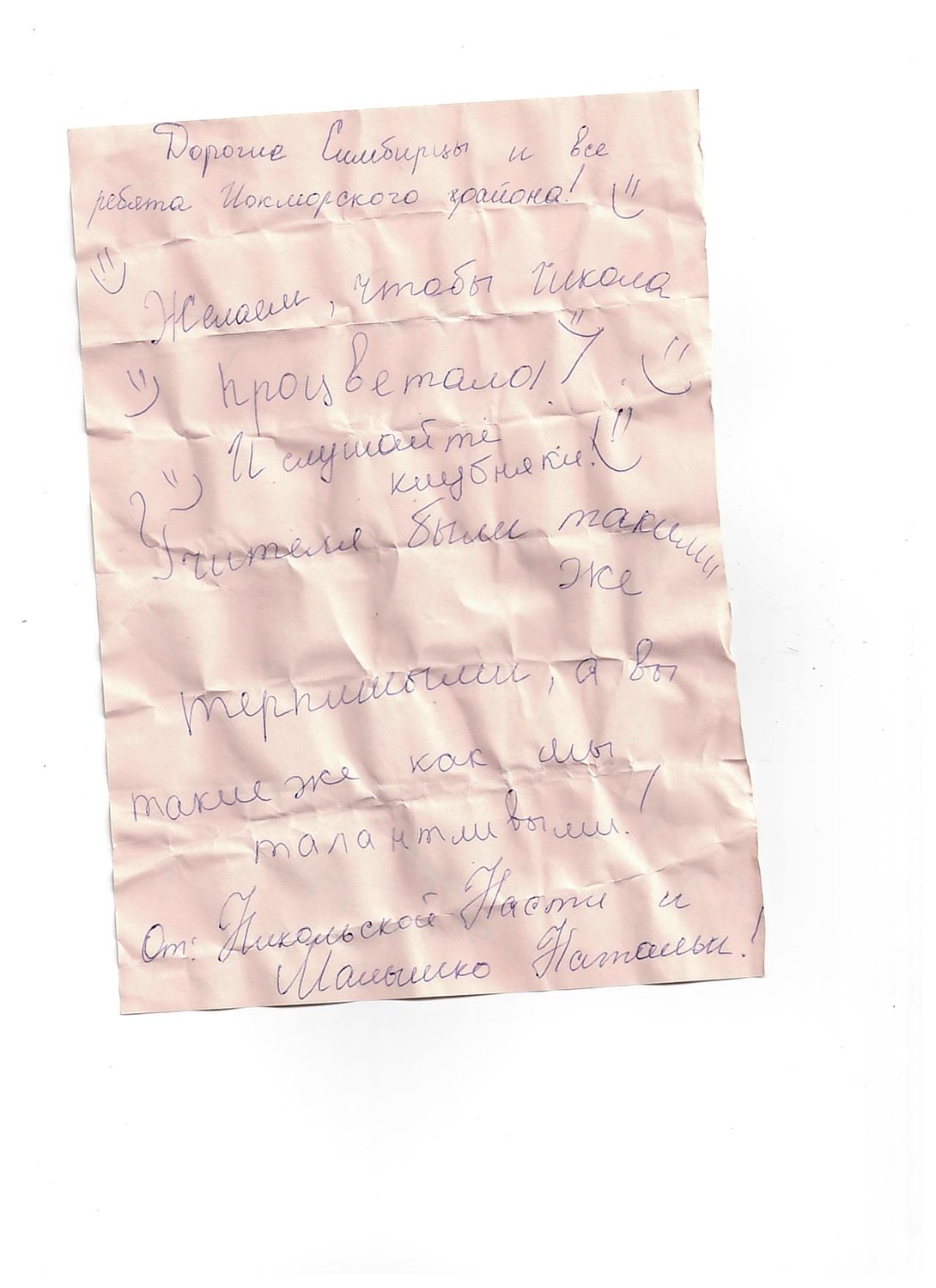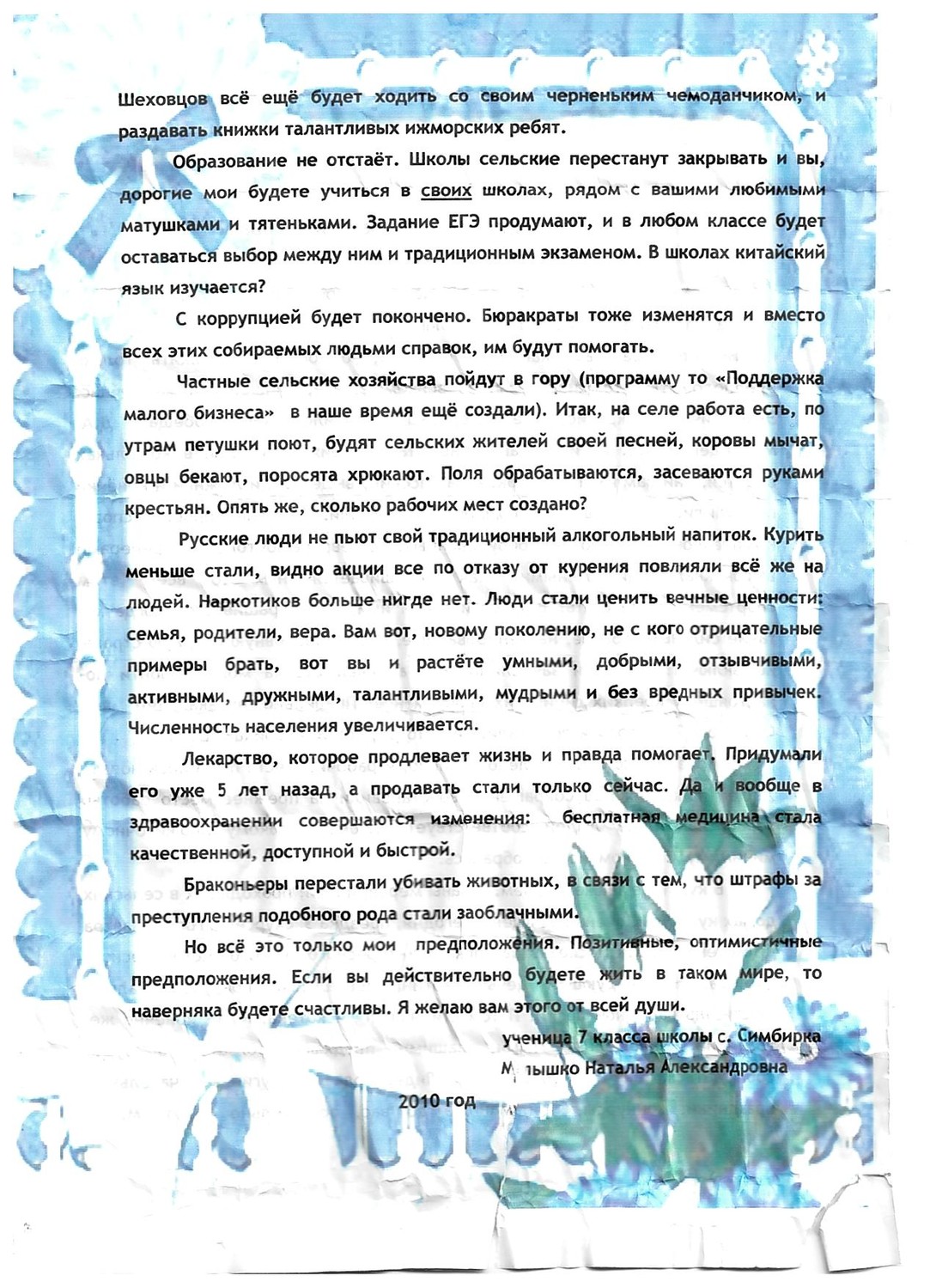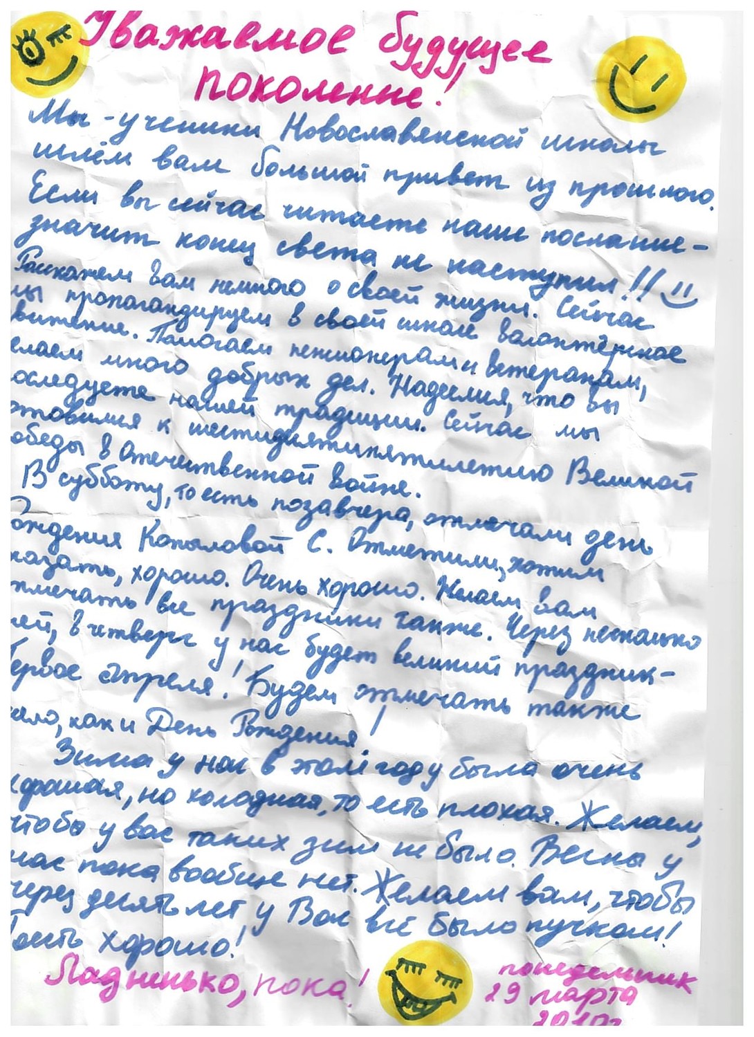 Ключом слёта стало вскрытие «пакета из прошлого», «капсул для потомков». 29 марта 2010 года активисты районного движения написали обращение к потомкам 2020 Среди них Ледовских Ксения, Безволенко Дарья, Чунина Вероника, Ледовских Настя, Тихова Светлана (Ижморская школа №1), Копылова Света, Аксенова Анжелика, Гольцман Алена (Новославянская школа), Лаптева Анна, Толмачева Елена, Селиверстова Екатерина, (Ижморская школа №2), Никольская Настя, Малышко Наталья (Симбирская школа), Иванова Юлия, Иванов Сергей (Берикульская школа), Бохан Ольга, Шубекина Ксения,Сидорова Кристина, Дорохова Екатерина (Постниковская школа), Ваганова Татьяна, Струкова Дарья, Ваганова Мария (Троицкая школа). Все ребята отметили, что в школах созданы волонтерские отряды, пожелали продолжать традиции, слушать клубняки, старались вывести школу на высшее место, ведите здоровый образ жизни как мы, путешествуем по родному краю и др.